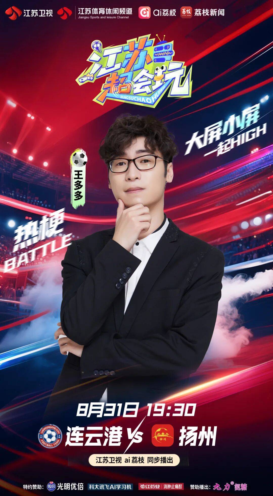 随着“苏超”常规赛临近尾声,淘汰赛席位的争夺已经进入白热化阶段。今晚19:30,由江苏卫视、ai荔枝跨屏联动打造的《江苏超会玩》将在大屏直播连云港队坐镇主场迎战扬州队的比赛,与此同时,还将小窗同步直播镇江队VS南京队、南通队VS苏州队的两场比赛。前九轮比赛结束后,连云港和扬州两支球队分列第九、第十,都在晋级区边缘徘徊。本场比赛,直面晋级路上最大的对手之一,两支球队必将全力争胜。本场比赛,有着“电竞诗人”之称的解说员王多多将惊喜加盟,与主持人李响一道,为大家带来精彩的赛事解说。